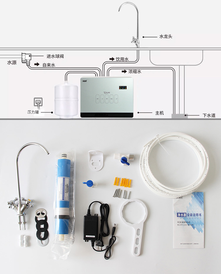 Product parameters Product size: 512*166*396mm (*The size is measured manually, there are errors, please refer to the actual product) Applicable water source: Municipal tap water Water temperature requirement: 5C-40℃ Water inlet pressure: 0.1-0.4Mpa Filtration accuracy: 0.0001 micron Filtration level: 6-level filtration Product features 1. 3 cups of good water and 1 cup of waste water, double water saving 2. 6-core 6-level RO reverse osmosis filtration 3. Smart panel, real-time control of working status 4. Effectively remove scale, bacteria, viruses, heavy metals, etc. 5. Support TDS water quality detection 6. Water for mother and baby to drink directly 7. Universal filter element, low maintenance cost in the later stage