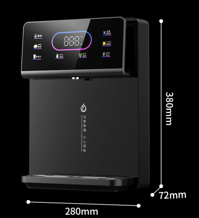 Product parameters Product size: 280*70*380mm (*The size is measured manually, there are errors, please refer to the actual product) Rated voltage/frequency: 220V~/50Hz Water inlet pressure: 0.1~0.4Mpa Power plug: 10A Product features 1. 5-stage quantitative water extraction 6-stage temperature control 2. Rare earth thick film heating 3. Safety child lock design 4. High-definition touch screen 5. Wall-mounted compact body